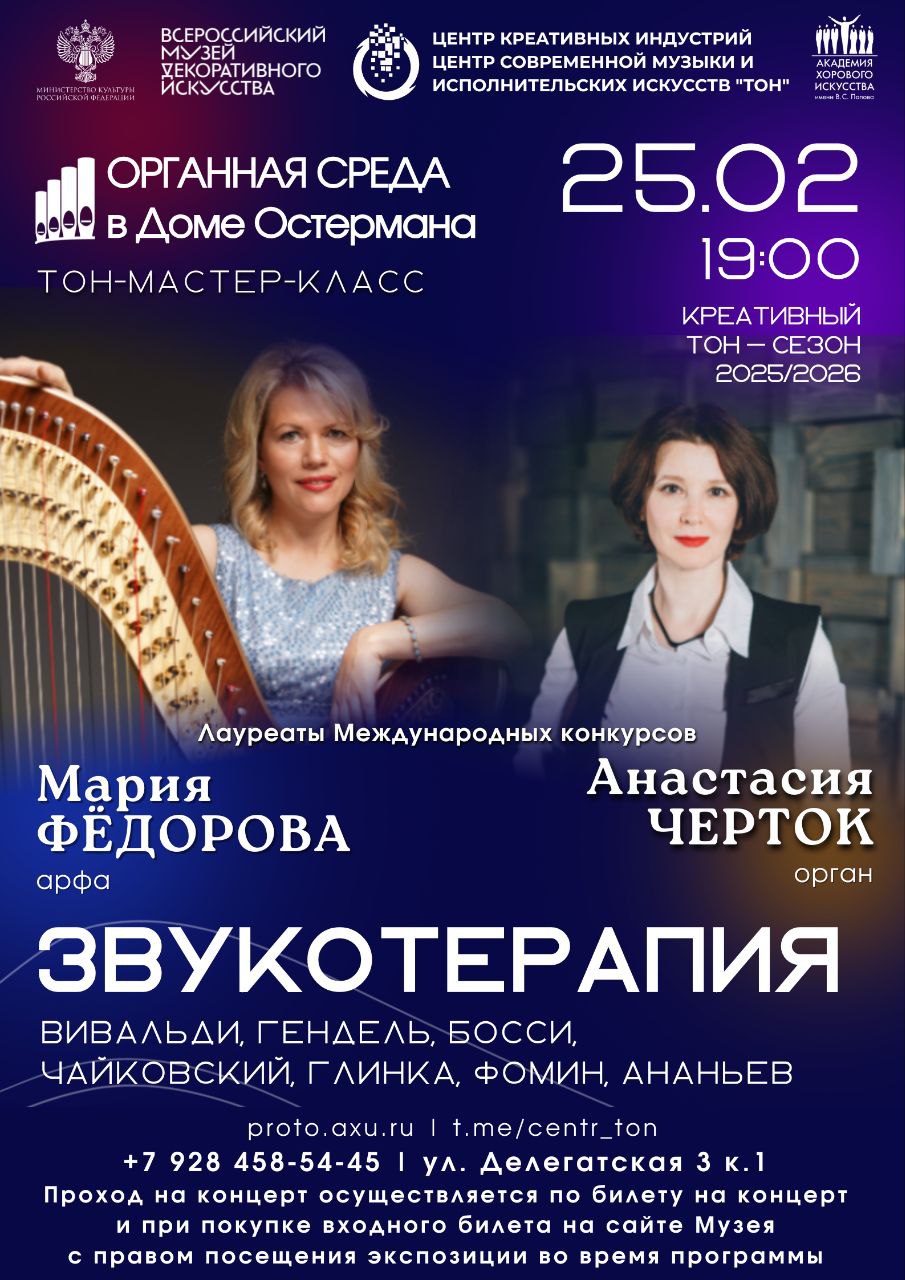 Центр "ТОН" представит очередной концерт цикла "Органная среда в Доме Остермана". Цикл создан по заказу Всероссийского музея декоративного искусства, во дворе которого отныне расположен прекрасный памятник одному из дипломатов Государства Российского - Графу Ивану Остерману. Музей продолжает "звучать" в креативном пространстве Центра "ТОН", мы создаем новые прототипы оригинальных программ, собственный орган Viscount Центра "ТОН" готовится к "Звукотерапии", - программа талантливого дуэта воспитанниц, и ныне доцентов, Московской консерватории: Мария Фёдорова(арфа)- Анастасия Черток(орган). Мария Фёдорова так же является кандидатом искусствоведения, а Анастасия Черток выпускницей Женевской консерватории.