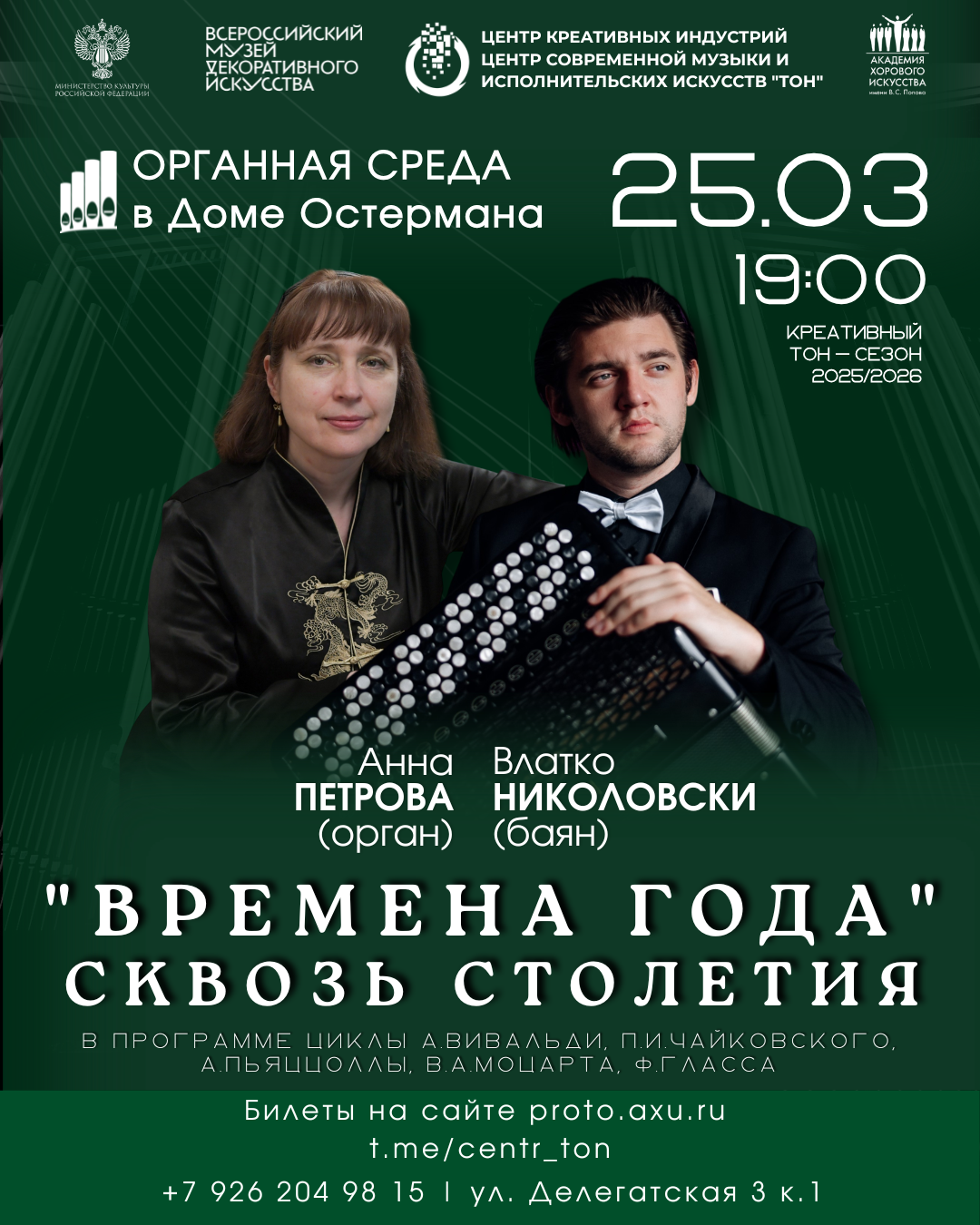 Мы приглашаем совершить музыкальное путешествие во времени и пространстве в сопровождении необычного дуэта талантливых исполнителей: орган и баян, в гармоничном сочетании голосов каждого, от имени харизматичных солистов и знатоков Музыки - профессор Анна Петрова (орган) и лауреат международных конкурсов