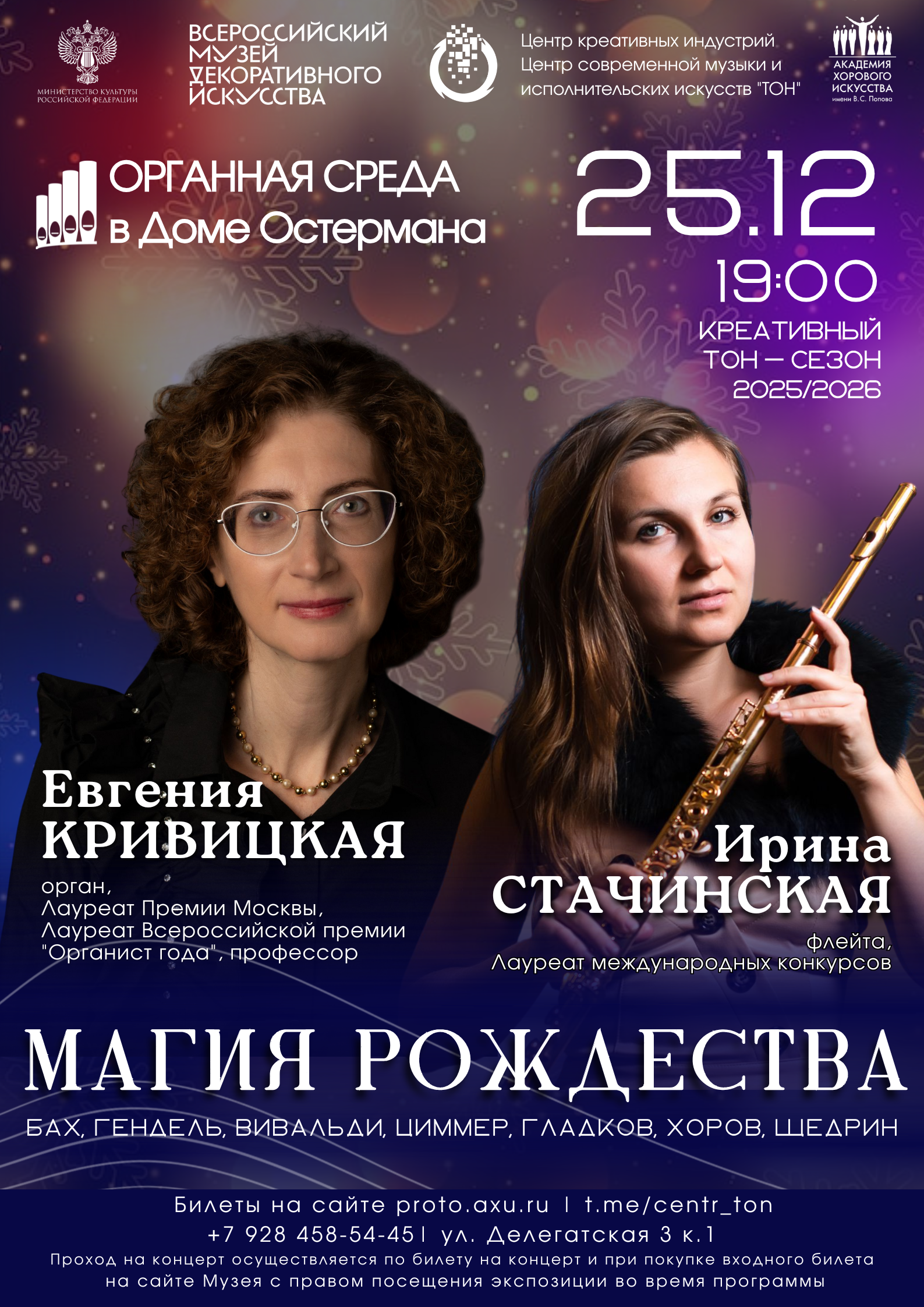 25 декабря - премьера новой программы «Магия Рождества» известного виртуозного дуэта Ирины Стачинской (флейта) и Евгении Кривицкой (орган). Рождественские дни – время надежды, мира и любви, и музыка как нельзя лучше выражает эти прекрасные чувства. В концертном зале Центра современной музыки и исполнительских искусств «ТОН» на площадке Всероссийского музея декоративного искусства прозвучат сочинения Баха, Генделя, Марчелло, Вивальди, а вторить и конкурировать с классиками будут современные композиторы: Ханс Циммер, Родион Щедрин, Геннадий Гладков, Денис Хоров и др. Эхо древнего Рождества найдет отклик в ярких красках музыки наших дней – в величественных звуках органа, в свирельных переливах старинной продольной флейты и виртуозных пассажах флейты современной.