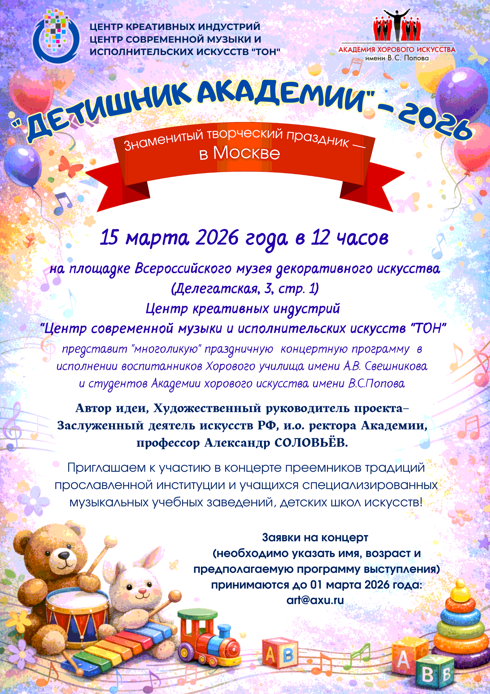 Автор идеи, Художественный руководитель проекта–Заслуженный деятель искусств РФ, и.о. ректора Академии, профессор Александр Соловьёв.